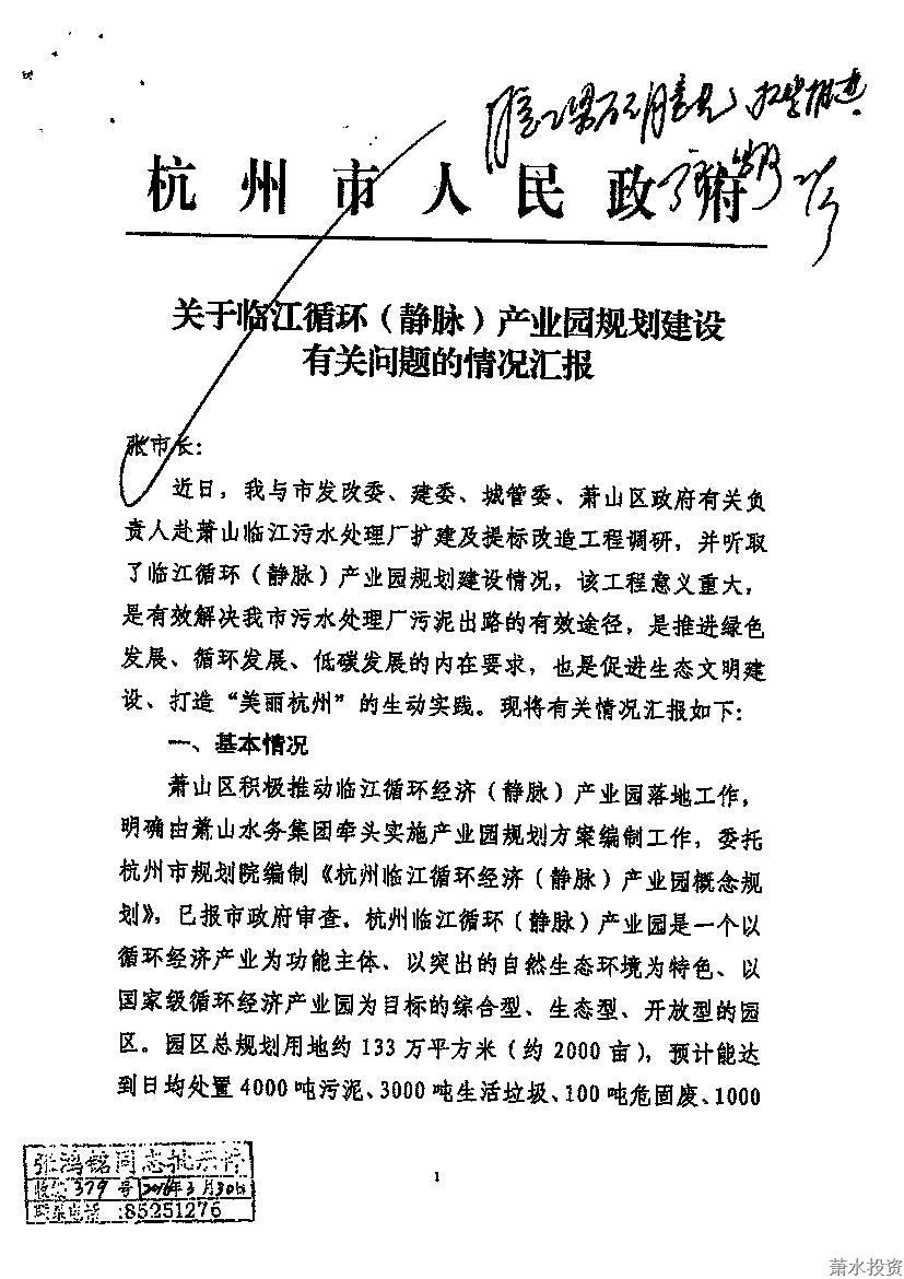 张市长指挥件中对临江循环经济(静脉)工业园项目作了高度评价,以为该项目意义重大,是解决我市污水处置惩罚厂污泥出路的有用途径,是推进绿色、循环、低碳生长的内在要求,也是增进生态文明建设、打造“漂亮杭州”的生动实践。由于工业园涉及AG真人国际官方网站区和大江东工业集聚区,权属治理问题重大,张市长赞成高照料的意见,催促市妄想局尽快组织计划审查并做好后续控规体例指导事情,要求市城投集团等相关部分提前介入,增强与工业园的周全战略相助,一揽子解决杭州市污水厂污泥、垃圾、飞灰、有毒有害固废协同处置惩罚问题。
