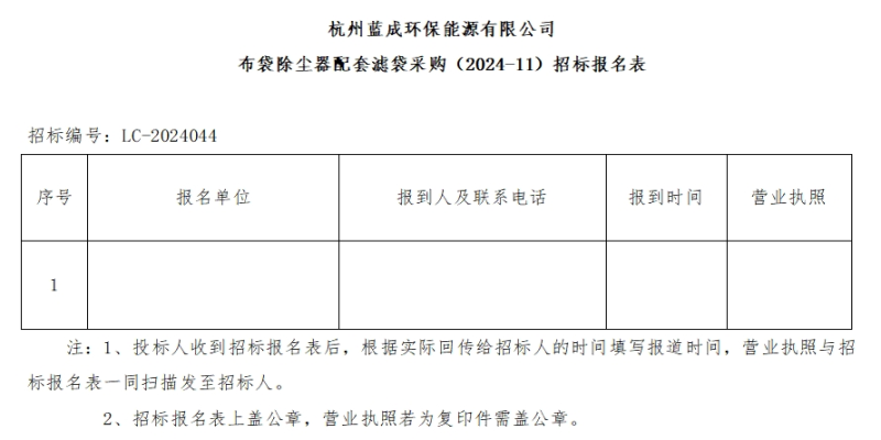 杭州蓝成环保能源有限公司布袋除尘器配套滤袋采购(2024-11)招标通告