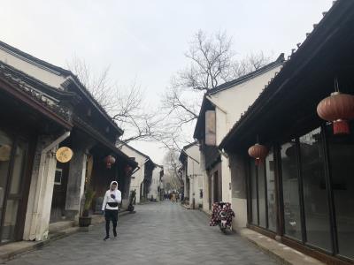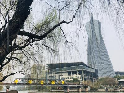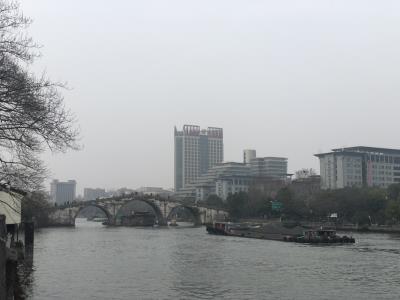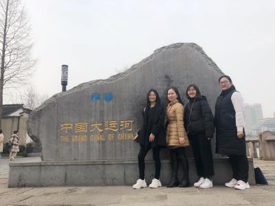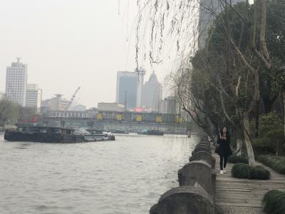 蓝成女同志踏着春风,信步走在运河滨,知否知否,桃始华,千里莺啼绿映红。