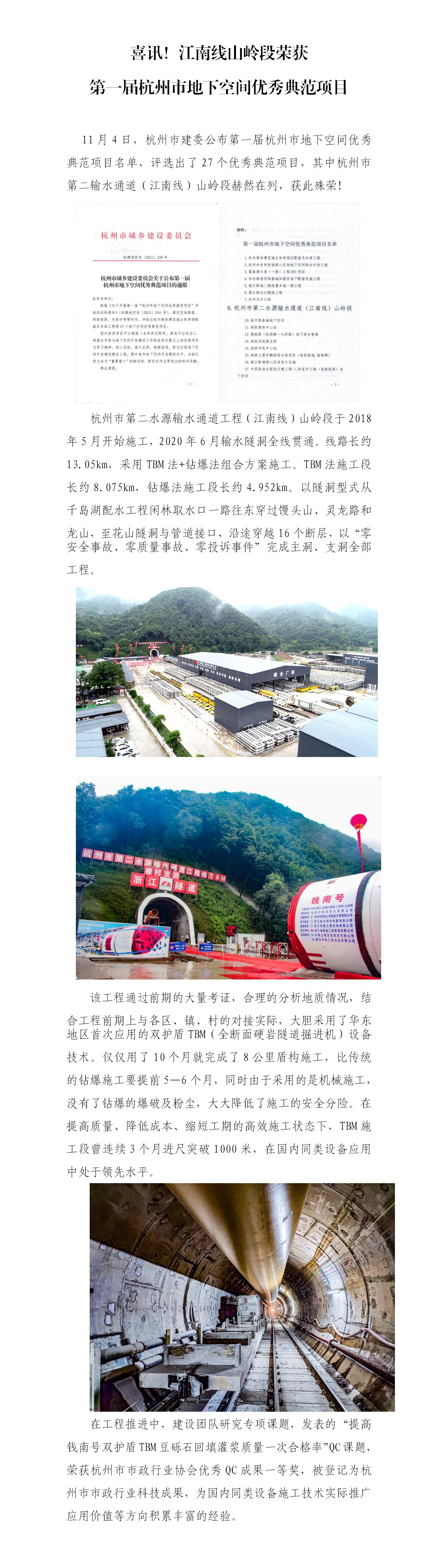 喜讯!江南线山岭段荣获 第一届杭州市地下空间优异规范项目