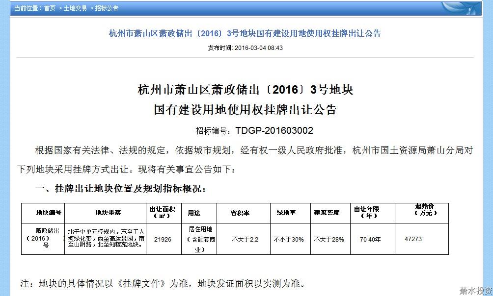 3月4日,投资公司肩负的北干街道棚户区刷新项目E-3地块以萧政储出〔2016〕3号地块命名,正式在AG真人国际官方网站区招投标治理信息网上宣布国有建设用地使用权挂牌出让通告,妄想在4月5日完成挂牌竞价。