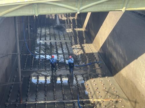 钱江厂在包管清静的主要条件下,连系实时天气情形,严密组织、科学调理、平衡施工;全体员工抢生产,保水量,争分夺秒抢夺工期,比原妄想提前14日完成大修,共计替换曝气膜片800余片,替换ABS立柱48根。